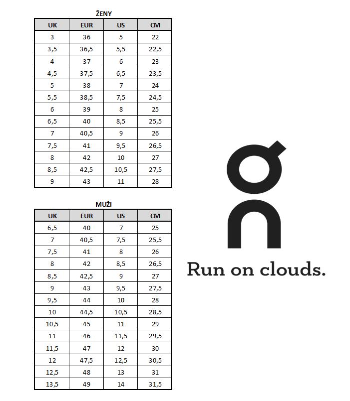 On Cloud veľkostná tabuľka
