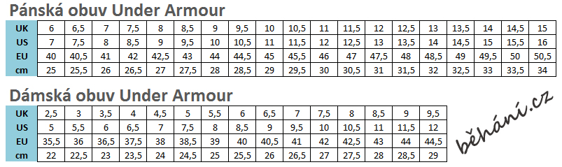 Under Armour Veľkostné tabuľky